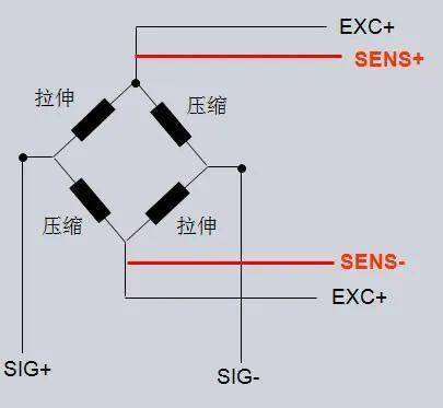 對于四線制傳感器,只有下圖黑色所示的四個電纜,其中EXC+和EXC-是稱重模塊給傳感器的激勵,SIG+和SIG-為稱重傳感器的輸出;對于六線制傳感器,會多出兩根紅色的線,SENSE+和SENSE-它們的作用是什么呢?這兩根線是做補償用的,當傳感器和稱重模塊的距離較遠時,這兩根線會進行補償,進而使得測量結果更精確一些。